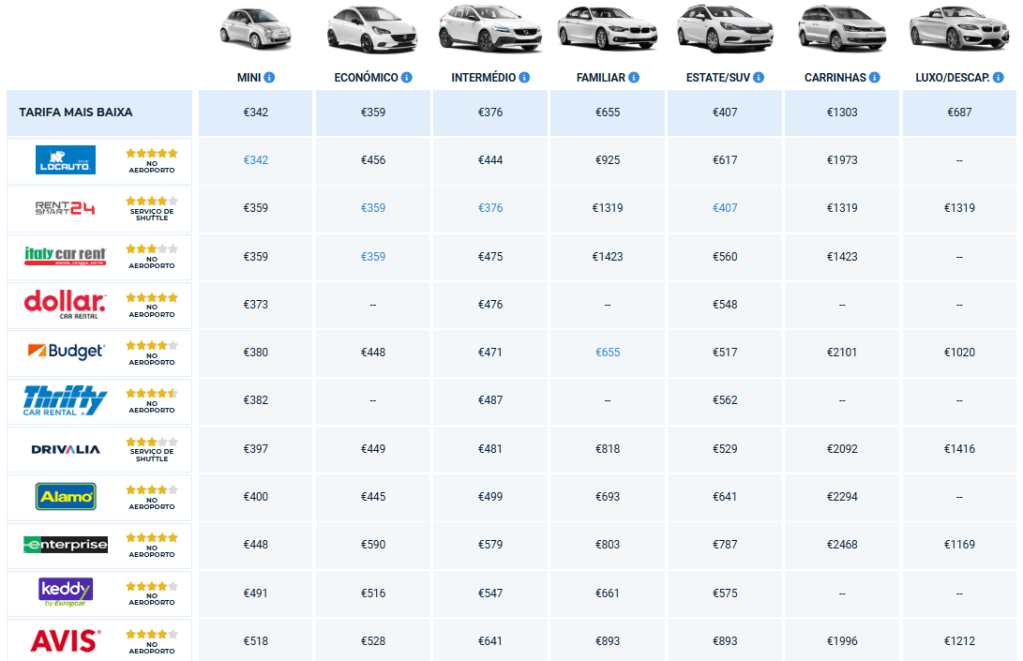 – GOLDCAR: em Lisboa, alugo muito (para rodar dentro de Portugal mesmo) diretamente na GOLDCAR, que geralmente tem os melhores preços entre as demais, além de ter um balcão DENTRO do aeroporto. O link é https://www.goldcar.com/pt-pt/ .