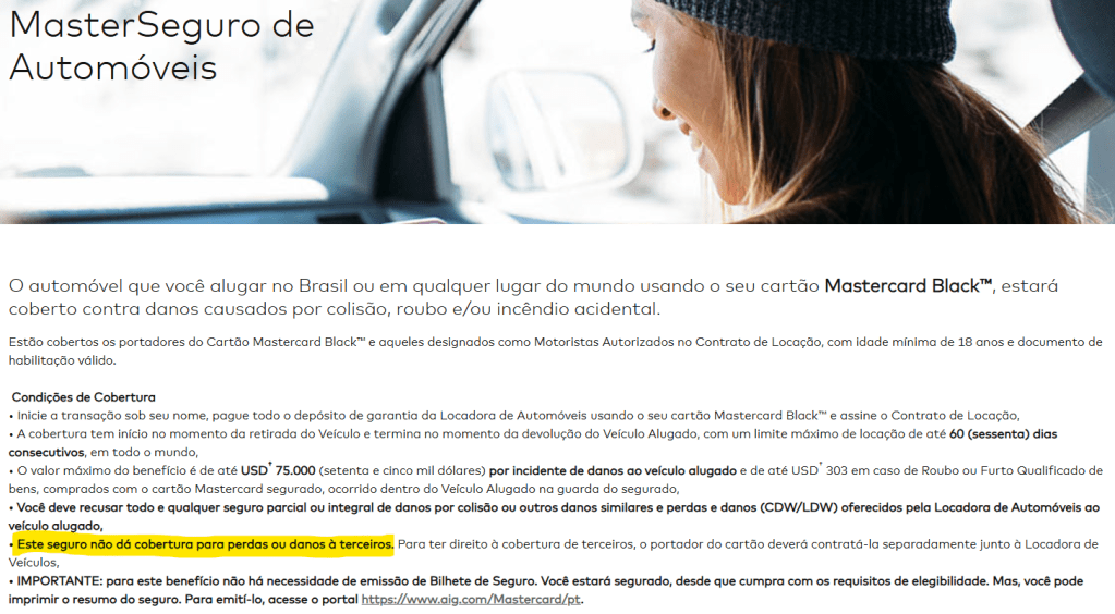 Há também limites de valor para o veículo alugado (por exemplo, American Express não permite veículos acima de US$ 50.000) e limites de tempo de locação (Visa/Mastercard Platinum até 31 dias, Mastercard Black até 61 dias).
