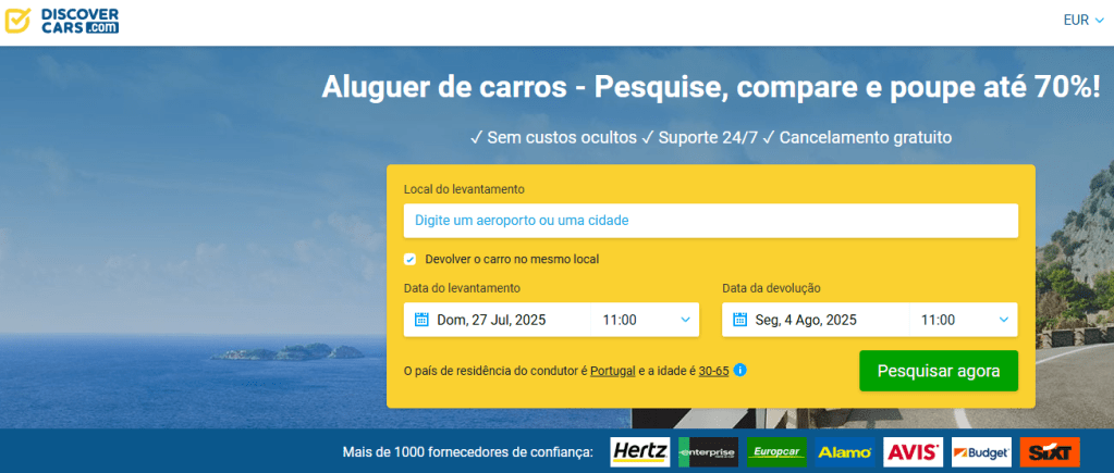 - DISCOVER CARS: é a que mais uso atualmente, pelos motivos que já informei. Coloco aqui o link de afiliado, para que tenha descontos e ajude o canal, mas não se sinta preso a isso, pode usar sem o afiliados ou escolher dentre os demais sites, claro: https://www.discovercars.com/?a_aid=victorramos